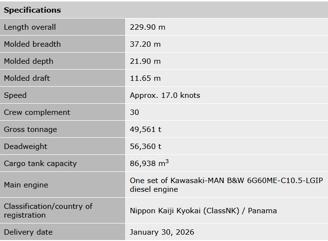 Tokyo, January 30, 2026 Kawasaki Heavy Industries, Ltd. announced its delivery of the LUCENT PATHFINDER (Kawasaki hull no. 1767), an 86,700 m3 liquefied petroleum gas (LPG) and ammonia (NH3) carrier powered by LPG fuel, for TSURUGI MARITIMA S.A.. Boasting an increased cargo capacity compared with the existing 84,000 m3 LPG carriers as well as ammonia loading capability, the LUCENT PATHFINDER is the eleventh of Kawasaki’s newest-design 86,700 m3 capacity, LPG-fueled LPG/NH3 carriers. As for LPG-propelled vessels, Kawasaki has completed eighteenth vessels to date, and the LUCENT PATHFINDER is its eighty-first LPG carrier in total. This carrier is equipped with separate cargo tanks and is capable of simultaneously transporting LPG, which is already in widespread use as a low-carbon-emission energy source, and ammonia, which may expect to serve as a useful new fuel amid widespread efforts toward the realization of low- and zero-carbon-emission societies. Furthermore, this carrier is designed to increase cargo tank capacity, while keeping its principal dimensions like LOA and beam similar to conventional-type vessels so that the carrier can be berthed at major LPG terminals around the world. In consideration of increasingly strict environmental regulations around the world, and based on action plans such as the Sustainable Development Goals (SDGs), Kawasaki will continue to develop and provide customers with environmentally friendly ship technologies with a focus on LPG carriers and LPG/NH3 carriers powered by LPG, as well as other types of merchant vessels that comply with the latest environmental regulations - including carriers for liquefied hydrogen, a fuel that is gaining popularity as a next-generation energy source. In this way, Kawasaki will contribute toward the realization of low- and zero-carbon-emission societies.