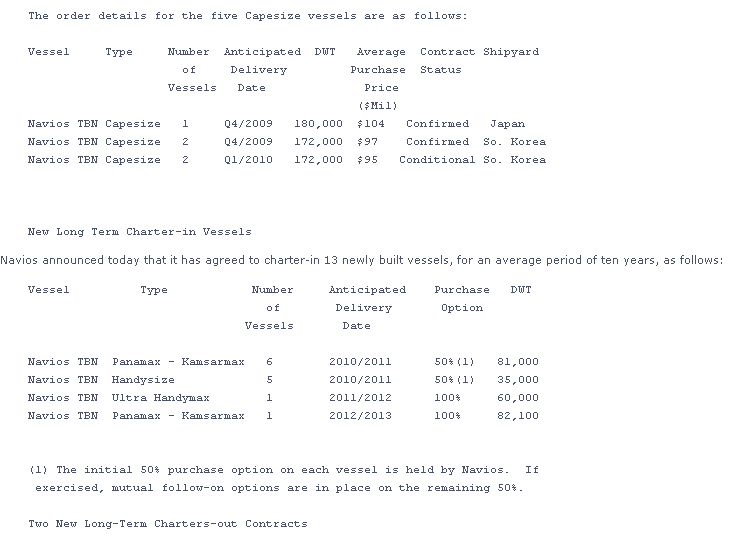 PIRAEUS, Greece, Oct. 29 /PRNewswire-FirstCall/ -- Navios Maritime Holdings Inc. ("Navios" or "the Company") (NYSE: NM), a large, global, vertically integrated seaborne shipping company, announced that it has agreed to purchase five new Capesize vessels. Three of the Capesize vessels are (i) a Japanese-built vessel (180,000 dwt) with a purchase price of $104.0 million and (ii) two South Korean-built vessels (172,000 dwt) with an average purchase price of $97.0 million. The acquisition of the two remaining Capesize vessels (172,000 dwt), for an aggregate purchase price of $190.0 million, is conditional upon the execution of definitive documentation.