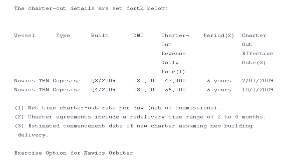 Navios announced today that it has entered into long-term time charters- out for two of its Capesize vessels with average charter periods of five years and average charter hire of $51,250 per day, net of commissions. Navios has previously announced the acquisition of these vessels and these two vessels are not included in today's acquisition announcement.