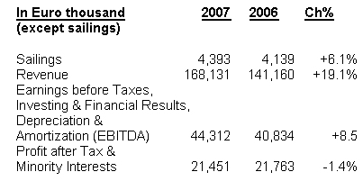 Net profit after taxes and minority interests stood at Euro 21.45 mln, slightly lower from Euro 21.76 mln in 2006. The decrease in net profits is due to the increase of financial expenses because of the increase of interest rates and the negative foreign exchange differences that arised during the fiscal year 2007. Furthermore, depreciation expenses increased due to the addition of Diagoras in our fleet and at the same time fiscal year 2007 does not include any extraordinary profits from sale of vessels that for the fiscal year 2006 stood at Euro 1.3 mln approximately.