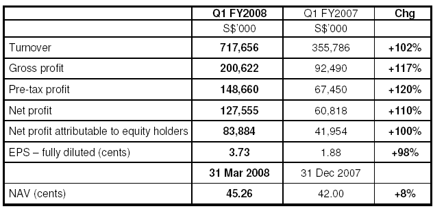 Group net profit attributable to equity holders doubled to $83.9 million in Q1 2008 on