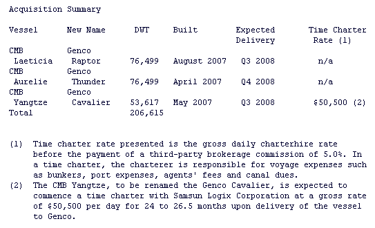 The three vessels, comprised of two Panamax vessels and one Supramax vessel, are expected to be delivered to Genco during the third and the fourth quarters of 2008. Upon completion of the acquisition, and including the four remaining Capesize vessels to be acquired from companies within the Metrostar Management Corporation group, Genco's fleet will consist of 35 drybulk vessels with a total carrying capacity of approximately 2,910,000 dwt and an average age of approximately 6.6 years.