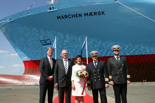 Mrs Ingrid Steenstrøm Nielsen, married to Mr Finn Buus Nielsen, Managing Director, Odense Steel Shipyard, honoured A.P. Moller – Maersk and the Yard by naming the newbuilding MARCHEN MÆRSK. More than 500 employees and companions from A.P. Moller - Maersk and the Yard were invited to celebrate the event.