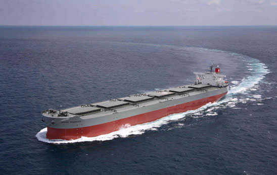 “GRANDE PROGRESSO” is the first very large ore carrier dedicated for loading at Brazil and unloading at Villanueva, Philippines* for JFE Steel Corporation. Aiming to be “the most optimum large-size vessel for iron ore shipment,” the vessel is the first of the “Unimax Ore,” the revolutionary 300,000 DWT type ore carrier that has the versatility to enter major iron ore loading ports in western Australia, while having a hull form most suitable for making the best use of very deep water of Villanueva and focusing on very deep water ports in Brazil, one of the largest place of iron ore loading.