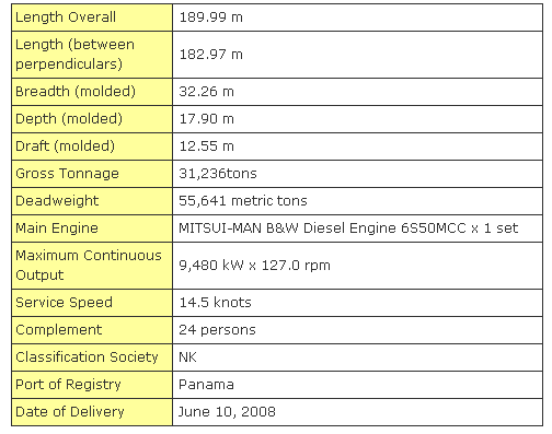 This vessel is a handy-max type bulk carrier of 56,000 dwt with a huge cargo hold capacity over 70,000 m3 and marks the 76th ship of its series.