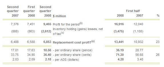 BP's second-quarter replacement cost profit was $6,853 million, compared with $6,488 million a year ago, an increase of 6%. For the half year, replacement cost profit was $13,441 million compared with $10,932 million a year ago, up 23%.