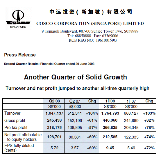 SINGAPORE (4 August 2008) – Singapore Exchange (“SGX”) mainboard-listed