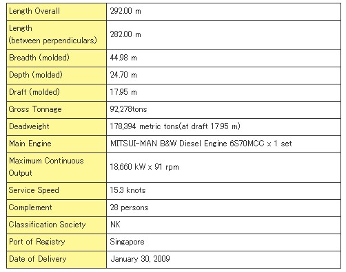 6. Main Engine of the ship is MITSUI-MAN B&W Diesel Engine 6S70MC-C, which satisfies IMO Environment Standards for Exhaust Gas and achieves improvement of fuel saving by optimum matching at normal service output. An electronic controlled cylinder oiling system is applied to the main engine achieving operational cost saving.