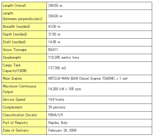 Mitsui Engineering & Shipbuilding Co., Ltd. completed and delivered a 110,000 dwt type double hull crude oil tanker M.T. “MARE NOSTRUM” (MES Hull No. 1678) at its Chiba Works to Fratelli d’Amico Armatori S.p.A., Italy on February 26, 2009. This is the 12th Aframax Tanker of 42 meter beam with the largest deadweight and the largest cargo tank capacity.