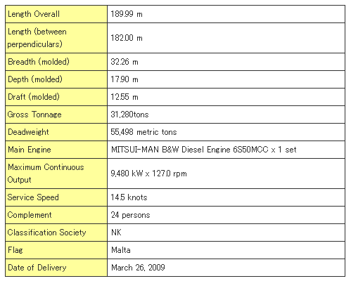 This vessel is a handy-max type bulk carrier of 56,000 dwt with a huge cargo hold capacity over 70,000 m3 and marks the 82nd ship of its series.