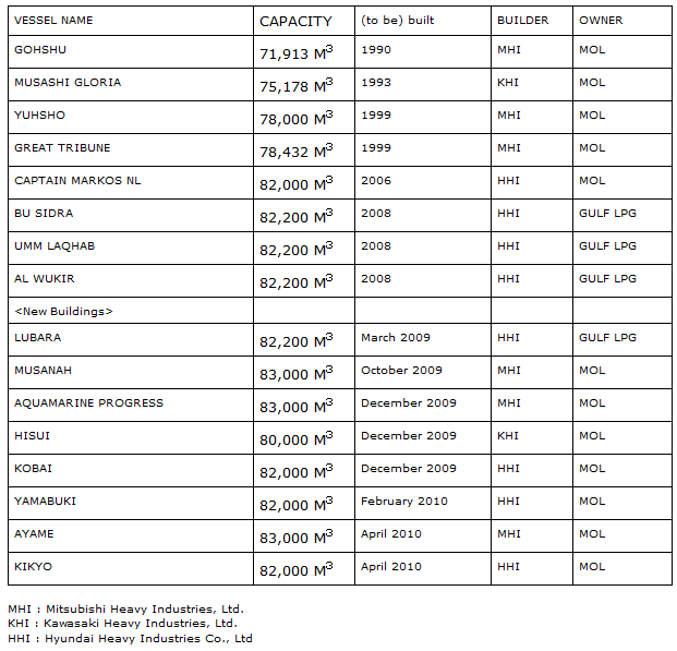 Both MOL and Gulf LPG are bullish about the future expansion of global LPG seaborne trade, especially from Qatar. LPG Global Transport will be able to offer enhanced services to LPG charterers and create efficiencies by optimizing voyage costs through efficient deployment of the combined fleet. To serve its worldwide customers in the most flexible, economical, and reliable manner, LPG Global Transport will build and expand its fleet as shown below. Gulf LPG will add one new building in March 2009 and MOL will add seven new buildings to be delivered during the second half of 2009 and the first half of 2010 to LPG Global Transport.