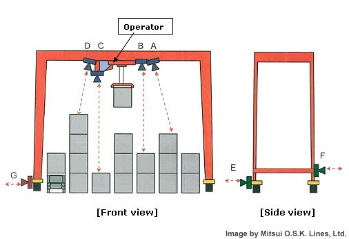 Sensors set in the upper parts of the crane (A. B. C. D) measure distances between the crane and the upper part of the tiered containers, to prevent contact and falling like dominoes among containers during loading/unloading.