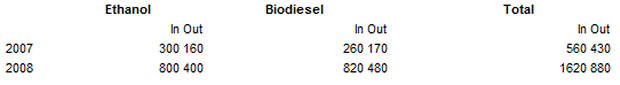 The transshipment of biofuels in the port of Rotterdam increased in the first half of 2008 from 1 to 2.5 million tonnes. The ratio of ethanol to biodiesel was almost 50/50. The products were manufactured mainly overseas: ethanol in Brazil and biodiesel largely in the United States. Part of the incoming trade was used on the continent and some shipped on further by smaller sea-going vessel to England and Scandinavia in particular. The outgoing flow, however, also contained production from the continent, brought in mainly by barge. Biodiesel throughput showed a particularly sharp increase: it almost tripled from 430,000 to 1,300,000 tonnes. This trend is expected to continue in the second half of the year.