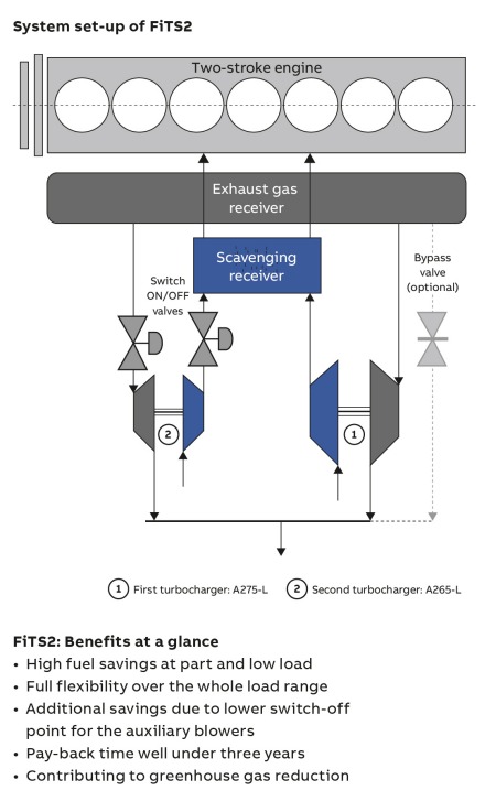 Greater flexibility and lower fuel consumption for vessels with two-stroke main propulsion. Shanghai, China - 7 December 2017 ABB Turbocharging announces its latest technology development, the Flexible integrated Turbocharg-ing System for Two-Stroke Engines (FiTS2) at Marintec China, December 2017. The new sequential turbocharging system allows maximum fuel savings for two-stroke engines at part and low load, and at the same time maintains the flexibility to go to full engine output immediately. This offers signifi-cant long-term economic benefits for vessel operators and charterers with potential for fuel savings of up to three percent, depending on load profile. Fuel and emissions reduction FiTS2 is the result of ABB’s continued commitment to reduce fuel consumption and emissions. It has been developed in close collaboration with low-speed two-stroke engine designer, Winterthur Gas & Diesel Ltd. (WinGD), which has developed a special tuning for FiTS2. The new technology enables two-stroke engine builders to offer more flexibility, increasing the potential for higher efficiency and lower operating costs for their customers. NOx emissions from engines fitted with FiTS2 will also remain within IMO Tier II limits. Additional abatement technologies like SCR or EGR can be used to comply with IMO Tier III NOx emissions and will not greatly affect the system while still delivering fuel saving benefits. Animation by ABB Adapting to operator needs