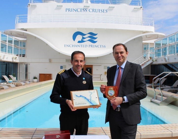 Enchanted Princess’ Staff Captain Raffaele Di Martino and ABP Port Director Alastair Welch. Image by Associated British Ports (ABP). Associated British Ports (ABP) Press Release