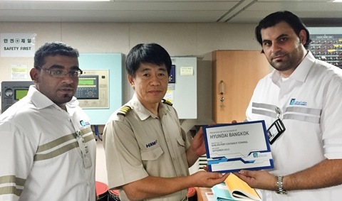 09/09/2015 Khalifa Port Container Terminal added a new service to its growing network list. Hyundai’s KMS service made her maiden call to Abu Dhabi’s main port on Saturday 5th September with the 6,800 TEU ‘Hyundai Bangkok’. Hyundai Merchant Marine (HMM) has become the latest carrier to increase their services at KPCT by adding the KMS service which provides a weekly port rotation between Korea and Middle East Gulf. This service represents the 4th new service calling at KPCT since the start of the year and further increases the number of direct international destinations from Abu Dhabi providing more choice for import and export companies that have a GCC focus. Simon Brebner, Abu Dhabi Terminals’ Chief Commercial Officer commented: “Our excellent relationship with HMM enables us to connect our customers to global markets. The newly added KMS service links Korea and the Far East directly to major ports in the GCC and has one of the best transit times in the trade which benefits our customers tremendously.” “By adding a 4th new service to our network in a short time span and a committed pipeline of developments and expansions, we are determined to continue our growth by expanding our services and providing more value to shipping lines, trade and logistics customers," he added. The KMS service rotation will be: Kwang Yang, Busan, Ningbo, Kaohsiung, Yantian, Hong Kong, Singapore, Port Kelang, Jebel Ali, Khalifa Port, Bandar Abbas, Karachi, Singapore, Hong Kong, Kwang Yang. ADT staff consisting of Mojahed Mousa, Shift Manager (right) and Abbas Ashoor, Superintendent (left) handed the plaque to Captain Gye Tae. Abu Dhabi Ports Company, press release