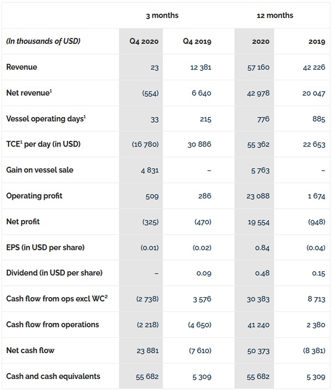 "The fourth quarter marked the completion of the sale of our first three vessels and we delivered on our commitment to return sales proceeds to shareholders, with a total of USD 51 million capital payment to be paid on or around 1 March 2021. As expected, net profit for the fourth quarter was around breakeven as we generated no revenue as a result of the disposal of the vessels, while we recognized an accounting gain of USD 4.8 million on vessel sales in Q4 2020. Since we made the decision to sell our vessels the reported day rates for tankers have been at consistently low levels, including below OPEX-levels for a prolonged period. We continue to closely follow the market for investment opportunities in tankers, as well as bulkers and the wider shipping sectors, but will remain highly disciplined with regards to vessel entry price since we believe this is critical in terms of limiting downside investment risk. Following the forthcoming capital repayment we expect to have approximately USD 4 million cash at bank and will return to the market for fresh capital when we invest in new vessels in the future." Full report About ADS Maritime Holding ADS Maritime Holding Plc is a public limited company listed on the Euronext Growth at the Oslo Stock Exchange (ticker ADS). The Company is incorporated and domiciled in Cyprus and has Norwegian subsidiaries based in Arendal, Norway. ADS Crude Carriers Plc press release