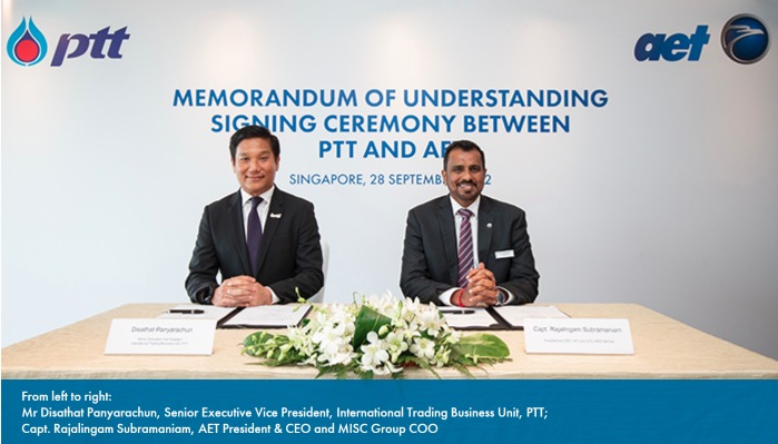 29 September 2022 PTT and AET have signed a Memorandum of Understanding (MOU) for the development and construction of two zero-emission Aframaxes to be powered by green ammonia. Jointly PTT and AET are taking the lead to encourage the use of green ammonia as a main propulsion fuel. AET will select a suitable shipyard and the two zero-emission dual-fuel tankers are to be delivered to PTT for long-term charters in Q4 2025 and Q1 2026 respectively. This MOU sets another clear signal of PTT's and AET's commitment to reduce Greenhouse Gas (GHG) emissions from international shipping as energy efficiency improvements alone will not be sufficient. Mr Disathat Panyarachun, SEVP, International Trading Business Unit, PTT: "PTT is very pleased to sign MOU with AET, a member of the MISC Group, for our study to develop the first net-zero emission Aframaxes as we are both aligned that the global shipping community must act now and we see green ammonia powered vessels as one of the pathways to achieve the decarbonisation goals. This latest partnership underscores PTT's vision of Powering Life with Future Energy and Beyond and the great importance we place on the development toward low carbon society and investment in clean energy as well as our long-term strategy to achieve carbon neutrality and net zero Greenhouse Gas (GHG) emissions." Capt. Rajalingam Subramaniam, AET President & CEO and MISC Group COO, said: "This MOU signing marks another significant milestone in our growing partnership with PTT as we both place great importance on driving the shipping decarbonisation journey ahead of 2050. Our collaboration with PTT also goes beyond these first two net-zero green ammonia powered Aframaxes. As like-minded partners, this MOU provides an avenue to work together on the design, safety and operational aspects as well as reskilling of mariners as part of the deliverables prior to the potential investment in this innovative project to meet the 2050 environmental agenda earlier than later. Providing the much-needed boost to create a green ammonia corridor in Southeast Asia would be another desired outcome of this MOU. For us, this collaboration with PTT will be complementary to the Castor Initiative, a multinational coalition championed by MISC and its Castor partners committed to make zero-emission in shipping a reality. With these latest net-zero vessels, AET is contributing further to the development of sustainability shipping to meeting the IMO's 2030 Greenhouse Gas (GHG) intensity reduction agenda and our commitment across the MISC Group to net-zero GHG emissions by 2050."