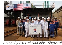 Aker Philadelphia Shipyard, Inc. (APSI), the sole operating subsidiary of Aker Philadelphia Shipyard ASA (Oslo: AKPS), held a ceremonial keel laying today for the first of two Aframax tankers that it is building for SeaRiver Maritime, Inc. (SeaRiver), Exxon Mobil Corporation’s U.S. marine affiliate. The construction of the two tankers, valued at $400 million, will create more than 1,000 jobs. When completed in 2014, the Liberty Class vessels will be 820 feet long and be capable of carrying 115,000 tons of crude oil. The tankers are intended to be used to transport Alaskan North Slope crude oil from Prince William Sound to the U.S. West Coast.