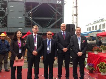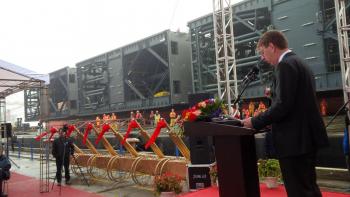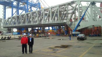 19 Mar 2015 The four gates for the Deurganck dock lock in the port of Antwerp will begin their journey from China at the beginning of April. The gigantic gates are being built by the Chinese steel constructor ZPMC, together with the trolleys on which the gates will ride, two combined road/rail bridges, the caisson and other items. A ceremony was held on Wednesday 18 March in the Chinese city of Changxing to mark the official completion of the construction work. The ceremony was attended by Freddy Aerts, head of the Maritime Access department (Flemish government), Luc Arnouts, director of the Deurganck Dock Lock Company and also Chief Commercial Office of the Port Authority, and Eric Beyts from the Waasland Lock construction consortium. Mr. Liu Jianbo, vice-president of ZPMC, emphasised in his speech how his company has been working hard on this project since 2011. For ZPMC, known worldwide for building gantry cranes, the project represents a new chapter in its offshore engineering activities. “And of course we hope that the bridges that we are physically building will also contribute metaphorically to mutual understanding between the Chinese and Belgian people,” he added. The gates The lock gates have the same length and thickness as those of the Berendrecht lock. However, the Deurganck dock lock will be 4 m deeper to handle the larger ships that are now coming into operation. This means the four gigantic lock doors will have dimensions of around 70 × 11 × 27 m (LxWxH) and will weigh 2000 tonnes each. Loading the gates and ancillary equipment on board the ship that will take them to Antwerp, the Zhen Hua 15, began on 3 March, and the outsize load is scheduled to arrive eight weeks later. Manoeuvering the lock gates into position will itself be a major operation that is expected to take at least two weeks. The constructor The steel construction work for the Deurganck dock lock was contracted out by the Waasland Lock consortium to ZPMC. The Chinese steel construction company is one of the largest gantry crane builders in the world. Since the worldwide recession, which also hit the shipping industry heavily, ZPMC has diversified into construction of civil engineering structures. It now builds bridges and other structures for customers all over the world. ZPMC has a whole arsenal of specialist construction equipment, a 5 km quay and its own fleet to bring the steel structures to the customers. It employs an estimated 30,000 people. Antwerp Port Authority, press release