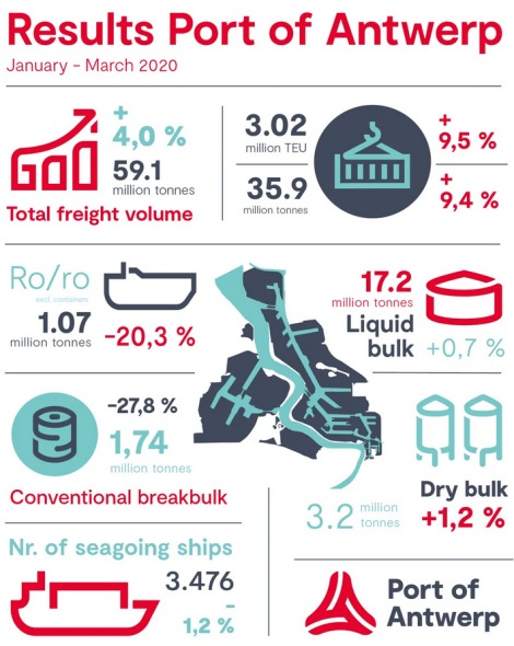 Impact of corona on Port of Antwerp The current pandemic is causing disruptions to production and supply chains around the world. Port of Antwerp is an international hub for the transport of goods and so will inevitably feel the effects of this. The impact of the crisis during the first quarter has remained fairly limited, but it will become apparent in the second quarter with cancelled departures, large sectors of industry such as the car industry in western Europe being shut down, and changing patterns of consumer behaviour. At the moment, however, it is impossible to predict the final impact on the global economy and thus also the volume of freight passing through the port of Antwerp. Much will depend on how quickly industry is able to start up again and consumer confidence to return. Port of Antwerp together with Alfaport-Voka will continue to monitor the situation among port companies and to take any measures that may be necessary. Port of Antwerp CEO Jacques Vandermeiren declared: "Thanks to its worldwide connectivity and the diversity of its trade, Port of Antwerp is less dependent on specific markets. Moreover the port has enormous storage capacity that can act as a buffer for the economy, which will permit faster restarting of industry and recovery of consumption in Belgium and part of Europe." Port alderman Annick De Ridder: "Port of Antwerp remains 100% operational despite the far-reaching social consequences of the corona pandemic. Freight handling and industrial production are continuing unabated, thanks to the efforts of the entire port community of employees and employers. All partners in the chain of production and supply are constantly monitoring the situation and making adjustments where necessary, thus enabling Port of Antwerp to react to the varying demand from the market. I cannot emphasise strongly enough how grateful I am to all those who are helping to keep the port operating." Antwerp Port Authority, press release