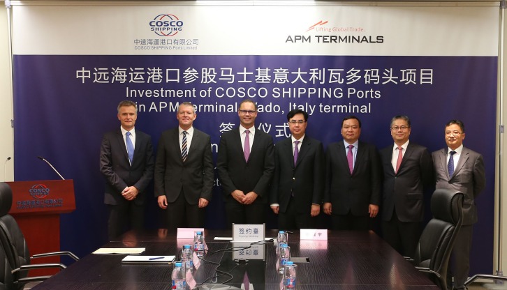 COSCO Shipping Ports and Qingdao Port International Development become partners with APM Terminals to operate the existing Vado Reefer Terminal, and the new deep-water container terminal under construction in Vado, Italy, opening in 2018. The Hague, The Netherlands – October 17 2016 APM Terminals has concluded an agreement with China COSCO Shipping Ports subject to customary conditions for the sale of a minority share in a new joint venture created for the APM Terminals Global Terminal Network’s operations in Vado, Italy. A similar agreement was also concluded with Qingdao Port International Development (Hong Kong) Co., Limited, a wholly-owned subsidiary of Qingdao Port International Co., Ltd. (06198.hk), which shall become an indirect minority shareholder in the joint venture. The agreements include interests in both the existing Reefer Terminal in Vado, the largest refrigerated cargo facility on the Mediterranean Sea, and the new 800,000 TEU capacity deep-water terminal currently under construction at the Port of Vado. APM Terminals will have a 50.1% share and will operate both the Reefer Terminal and the APM Terminals Vado container terminal; COSCO Shipping Ports will have a 40% share and Qingdao Port International Development (Hong Kong) Co., Limited a 9.9% share. The signing ceremony with COSCO Shipping Ports was held in Shanghai, and attended by current APM Terminals CEO Kim Fejfer, as well as Mr. Morten Engelstoft, who will succeed Mr. Fejfer as CEO on November 1st. “Through global partnerships and shared goals of operational excellence, there is much we can achieve together, even in the current difficult business environment” stated Mr. Fejfer, adding “and we are pleased to build upon our close relationships with COSCO Shipping Ports, and the Qingdao Port Group.” COSCO Shipping Ports is a subsidiary of COSCO Shipping Group which assumed control over the Greek Port of Piraeus earlier this year. With the support of its affiliated shipping line, COSCO Container Lines, the world’s number one in total tonnage and number four in container capacity, COSCO Shipping Ports has been expanding its operations in the Mediterranean Region as part of the “One Belt One Road” initiative to strengthen logistics links between China and Europe. COSCO is already a shareholder in several operations within the APM Terminals Global Terminal Network, such as the Suez Canal Container Terminal, in Egypt; APM Terminals Zeebrugge, in Belgium; and Qingdao Qianwan Container Terminal (QQCT) in China. APM Terminals and the Qingdao Port Group, which has also been expanding its global presence, have existing joint venture relationships with shared investments in QQCT and four other container terminals in Qingdao, and most recently, Qingdao Port Dongjiakou Multi-Purpose Terminal. Qingdao Port is the fifth-largest container port on the Chinese Mainland, and the 8th-largest world-wide, with 17.4 million TEUs handled in 2015. The Port of Vado is located in north-western Italy in the region of Savona on the Ligurian Coast, near Genoa, Italy’s busiest container import/export port, with a throughput of 2.24 million TEUs in 2015. The expansion of Vado’s facilities is part of the port’s master plan to create new and improved supply chain capabilities for markets in Northern Italy, Switzerland and Southern Germany. APM Terminals Vado will be a new semi-automated container terminal scheduled to become operational in 2018, with the unique ability to accommodate Ultra-Large Container Ships (ULCS) of up to 19,000 TEU capacity without any physical restrictions among North Italian ports. In August 2015, APM Terminals purchased the existing Vado Ligure Reefer Terminal, which has an annual capacity of 275,000 TEUs and more than half a million tons of refrigerated fruit. Operations at the Reefer Terminal will be merged upon completion with the adjacent APM Terminals Vado container terminal.