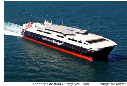 “Having spent a significant amount of time at Austal during the construction of “Leonora Christina”, I am confident that this vessel will perform well and exceed the expectations of the Bornholm public.” “After participating in recent sea trials, I am satisfied that “Leonora Christina” has fulfilled its speed requirements, while its proven seakeeping capabilities will ensure maximum passenger comfort throughout the 90 minute journey from Bornholm to Ystad,” said Senior Captain Schow. Austal Chief Executive Officer, Andrew Bellamy, congratulated employees at Austal’s Henderson shipyard on the completion of “Leonora Christina”, commenting that the vessel will soon be the pride of Bornholmer Færgen’s fleet. Vessel Review Austal was awarded the contract to build “Leonora Christina” in April 2009, following a competitive international tender process which saw Austal utilise its in-house design team and experience to develop a highly customised vessel design that met all of Færgen’s requirements for the route. “Leonora Christina” has also been built to comply with stringent Danish regulations, covering environmental noise, wave-wash and exhaust emissions, as well as ergonomic working arrangements for the crew and strict fire and safety standards. Austal’s proven design experience enabled the 113m “Leonora Christina” to be customised to fit Bornholmer Færgen’s existing high speed ferry berths, which it will share with the smaller “Villum Clausen”. This resulted in significant savings for the operator, as only minimal modifications were needed to be made to the ports of Ronne and Ystad. “Leonora Christina” maintains the tradition for high standard ferry services offered by Scandinavian operators in general and Bornholmer Færgen in particular, not only in terms of performance, but also with regard to safety, comfort and quality of finish. Seating for the vessel’s 1,400 passengers is spread over the upper and bridge decks. Ample room and luxury fittings are evident throughout the vessel’s refined, high quality interior, which reflects contemporary Scandinavian design aesthetics. Natural lighting and timber finishing deliver a feeling of light and space throughout the vessel, with large skylights located in the vessel’s atrium completing the look. High levels of passenger comfort are ensured with a range of fixed and adjustable Beurteaux seating throughout the vessel in a variety of complementary colours. The main passenger facilities on board "Leonora Christina" are located on the upper deck, which is split into several distinctive lounge areas along its length, each featuring its own style of seating, colour scheme and facilities as well as extensive use of glass to ensure a sea view for all. LCD TV screens are located throughout all passenger areas, with a screen visible from every seat in the interior of the vessel. Bornholmer Færgen is particularly renowned for its high quality food and beverage service, and the facilities on “Leonora Christina” will assist the crew to exceed expectations not only in food quality but efficiency of delivery. The large galley features ergonomically adjustable bench heights and extensive food storage and preparation services, along with a raft of features to enable rapid replenishment during the vessel’s short time in port. The design and layout of the food servery is unique to Bornholmer Færgen, with Austal’s design team working to ensure maximum efficiency and flow of people through food service areas. Adjacent to the servery is the shop, which features the same high quality finishes found throughout the vessel. Tables and chairs border both sides of the servery, allowing passengers to enjoy their meals whilst taking in the panoramic ocean views. A separate bar and café facility towards the bow of the vessel is also available to serve drinks and snacks throughout the duration of the voyage. A must on every ferry is a children's play area and "Leonora Christina" is no exception. Located in the upper passenger deck near the atrium, the playroom is one of the brightest areas of the vessel and features a 42 inch flat screen TV with DVD and surround sound capabilities. “Leonora Christina” has also been designed to allow maximum wheelchair accessibility, with two lifts allowing disabled access from the vehicle to the passenger decks, together with designated wheelchair seating locations in the forward lounge in close proximity to the cafe. The vessel’s wheelhouse contains ergonomically designed navigation and control stations for the Captain and Navigator as well as a fully integrated monitoring and control system featuring Austal’s Marine Link system which provides the Ship’s Engineers with the ability to monitor and control the vessels safety, propulsion, generating and other operationally critical systems. The wheelhouse extends across the full width of the vessel and provides the crew with maximum visibility, while fully equipped bridge wings on both the port and starboard sides enable safe docking of the vessel in the confined ports of Ronne and Ystad, especially in winter fog, snow and other adverse conditions. A fully equipped crew mess, and multiple crew storage areas add to the comfort and functionality of the vessel. The vessel’s three vehicle decks offer a total capacity of 300 truck lane metres, or a maximum of 357 cars, which are accessible via both bow and stern ramps, ensuring efficient ‘drive through’ loading and unloading of the vessel, thereby keeping turnaround times to a minimum. The fitting of hoistable vehicle decks provides Bornholmer Færgen with the flexibility to carry a mix of cars and freight. Lightweight structural fire protection, zoned sprinkler systems and hydrants ensures optimal fire safety during vehicle transport. With the ability to operate at speeds of up to 40 knots, “Leonora Christina” is powered by four MAN 20V28/33D engines, each capabl