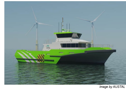 “For offshore wind farm industry operators seeking to maximise productivity and safety in rough seas, this new hullform provides the highest possible levels of seakeeping, passenger comfort and fuel efficiency,” Mr Bellamy said. Managing Director of Turbine Transfers, Captain Mark Meade, said his company was using Austal technology to support the next phase of wind farm development which would see a much larger number of turbines installed farther offshore and in other areas with rougher sea conditions. “To do that we need to be able to transfer further, and in larger waves, while still providing the technicians we carry with comfortable transits and safe turbine step-offs,” he said. “The extensive analysis and tank testing that Austal has done makes me very confident that this new boat will enable us to do that, and provide us with a competitive advantage.” Andrew Bellamy said the new design would improve the viability of offshore wind farms by overcoming the seakeeping limitations of the support vessels currently used in the industry. “To date most wind farms have been relatively close to the coast, and serviceable with fairly basic boats. Now as they move further offshore there is a need for a second generation of vessels that can address the significant challenges this brings. “Being able to transport wind turbine technicians comfortably in the rougher sea conditions over longer distances is the key requirement, and we have produced the solution to that need,” he said. As well as minimising seasickness amongst personnel and providing safer transfer conditions, the new design’s enhanced seakeeping performance can improve the economics of offshore wind farms. “Being able to operate in a broader spectrum of sea conditions increases overall operability which means there is the potential to reduce the number of vessels and personnel required to support a given site; reducing capital and operating costs without sacrificing power generation reliability,” Mr Bellamy explained. Turbine Transfers is a wholly owned subsidiary of Holyhead Towing Company, which has been operating work boats since the early 1960s. Turbine Transfers currently operates a fleet of over 20 fast catamarans that transport personnel and equipment to and from offshore wind turbines. Its long term customers include Siemens, RWE NPower, Van Oord, Dong Energy, EnBW and Royal Boskalis Westminster. The order is part of the company’s ongoing fleet expansion plans which already includes three 21 metre catamarans ordered from Austal in July 2011. Construction of those vessels is progressing well, with delivery scheduled for May this year. The new Turbine Transfers vessel is designed to operate in ocean areas of all European countries, including in the demanding conditions of the North, Irish and Baltic Seas. It is designed to operate in up to 3.0 metres significant wave height. The 27.4 metre long, 10.5 metre wide vessel will be operated by three crew and be able to transfer 12 wind farm technicians, their effects and over four tonnes of deck cargo, stores and miscellaneous equipment. Two 900kW MTU diesels coupled to waterjets will provide a service speed of 23 knots, with the directional thrust of the waterjets being supplemented by a bow thruster for low speed manoeuvring and station keeping. With an operating range in excess of 360 nautical miles, the vessel will be able to operate up to 75 nautical miles offshore, well beyond the distances of current wind farms. The vessel will initially be chartered to Turbine Transfers for a period of up to five years. It is scheduled for completion in November. Austal press release |