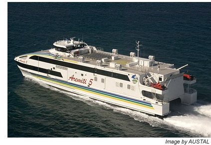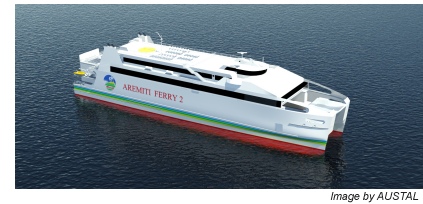 With a capacity for up to 967 passengers and up to 146 cars, or a mix of cars and trucks, the new ferry will be French-flagged and is designed to meet EU domestic voyage rule requirements. In addition to enabling local tourism and personal transport, the ferry will support inter-island trade. To do this the vessel has substantial truck capacity and will be certified to carry dangerous goods including flammable gasses and flammable liquids. With bow and stern ramps enabling drive through operation, the vehicle deck features hoistable mezzanine decks and nearly 230 freight lane-metres suitable for trucks weighing up to 50 tonnes. Passenger seating will be split over two levels, with the bridge deck accommodating up to 435 passengers in one spacious lounge. The 532 passengers on the upper deck will be divided between two lounges, increasing comfort and reducing passenger disruption. The aft section features table and chair arrangements as well as tub and lounge style seating, with the forward section predominantly aircraft style seating. A kiosk is located in the middle of the upper deck, and passengers are also able to access a 114 seat sun deck. The design meets the latest EU regulations governing access for disabled persons and persons with reduced mobility. This includes providing facilities for up to 24 passengers in wheelchairs, with a lift aft providing access between the main, upper and bridge decks. Crew facilities include a laundry and separate crew and officers mess areas. The ferry will be powered by four MTU 16V 4000 M53R engines coupled to fixed pitch propellers. Four rudders and twin bow thrusters combine to provide excellent maneuverability. The Austal ride control system comprising of forward T-foils and aft interceptors will enhance passenger comfort by reducing vessel motions, and enables trim to be adjusted to enhance operating efficiency. Aremiti has been operating shipping services between Tahiti and Moorea since 1991. Its current fleet includes the 56 metre high speed ferry “Aremiti 5” which Austal delivered in 2004. Vessel Specifications Principal Particulars Length overall: 79.60 metres Length waterline: 78.20 metres Beam (moulded): 17.00 metres Depth (moulded): 5.90 metres Hull draft (approx): 3.50 metres Capacity Passengers: 967 Vehicles: 146 cars/up to 228 truck lane-metres Crew: 20 Propulsion Main engines: 4 x MTU 16V 4000 M53R Propulsion: 4 x Fixed pitch propellers Performance Speed: 20 knots Classification Germanischer Lloyd Flag French Flag Austal press release |