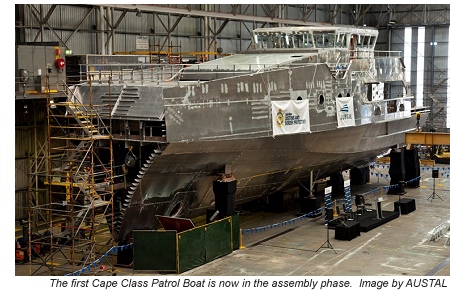 “Like our US Navy projects, this program shows that Austal can do more than design and manufacture world-class ships. We are also taking the prime contracting role and using in-house expertise to develop and integrate sophisticated electronic systems for command, control and communication. We are also building on our existing capabilities to establish and operate a comprehensive and effective in-service support system for the fleet,” Mr Bellamy said. “This total solution capability represents the future of our Australian business, as we continue to expand and enhance the strategic industry capability necessary to meet the current and future defence needs of Australia and other nations,” he said. Mr Bellamy said the fact that Austal had been awarded the contract after a rigorous, open international tender process by a highly experienced and meticulous customer reflected the company’s ability to successfully compete in the global market. “This is the Australian Government getting the best possible value regardless of supplier nationality, and that’s the basis upon which we secured this work. “The fact that we are on track to deliver that capability, as promised, is a credit to all involved. It reflects the skills and hard work of our staff, many of whom bring invaluable experience from previous government contracts carried out both here in Australia and at our US shipyard,” he said. Construction of the first Cape Class Patrol Boat will continue in accordance with schedule, with launch due in December this year prior to sea trials and delivery to Customs and Border Protection in March 2013. Austal’s eight year support contract for the fleet encompasses a full range of intermediate and depot level maintenance activities. The Cape Class Patrol Boats will play a significant role in protecting Australia’s borders from multiple maritime threats, and have been designed to have greater range, endurance and flexibility, as well as enhanced capability to operate in more severe sea conditions than the current Customs and Border Protection fleet. The aluminium monohulls can operate at 25 knots and have a range in excess of 4000 nautical miles. Each can undertake simultaneous operations with two embarked 7.3 metre rigid hulled response vessels. Project Background Austal was awarded the contract for the design, construction and through-life support of the Cape Class patrol boats for the Australian Customs and Border Protection Service in August 2011. The eight 58 metre aluminium monohulls are due to be delivered between March 2013 and August 2015. The support contract extends for a minimum period of eight years and encompasses a full range of intermediate and depot level maintenance activities. Further options can be exercised by the Australian Customs and Border Protection Service for In-Service Support for the life of the Cape Class Patrol Boat Fleet. The Cape Class Patrol Boats will have greater range, endurance and flexibility in responding to maritime security threats than the current fleet. These vessels will also have enhanced capability to operate in higher sea states and survive in more severe conditions. The Cape Class Patrol Boats will be able to: • Undertake 28 day patrols; • Sail 4,000 nautical miles before having to refuel; • Combat the full range of maritime security threats; • Carry a larger crew to more effectively and safely manage boarding operations; • Identify, track and intercept an extended range of threats in the maritime domain and gather intelligence and store evidence for matters that may proceed to the courts; and • Launch two Tender Response Vessels simultaneously. Customs and Border Protection patrol boats may be deployed according to aerial surveillance, community reports and/or radar sightings. They may be used to: • Counter people, drug and weapons smuggling; • Apprehend foreign fishing vessels; • Gather information and intelligence; • Monitor environmental pollution; and • Assist management of offshore nature reserves and marine parks. Austal press release |