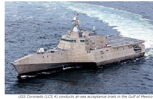 Independence-variant Littoral Combat Ship Coronado (LCS 4) successfully completed Acceptance Trials (AT) on August 23, 2013, in the Gulf of Mexico. This milestone achievement involved the execution of intense comprehensive tests by the Navy while underway, which demonstrated the successful operation of the ship’s major systems and equipment. This is the last significant milestone before delivery of the ship, which is expected in September.