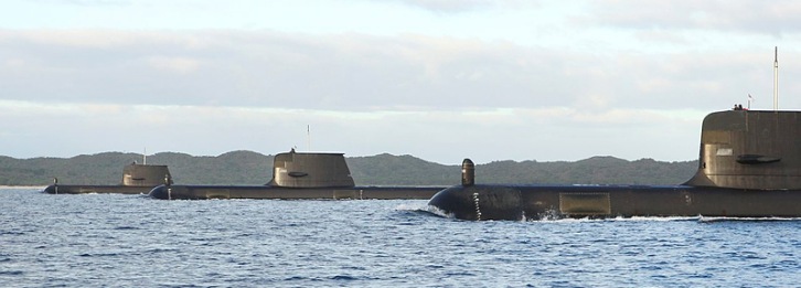 Collins Class Submarines, L to R: HMAS Collins, HMAS Waller and HMAS Rankin transiting in formation through Gage Roads, Cockburn Sound off Austal’s Defence Facility in Perth. Image by Austal
