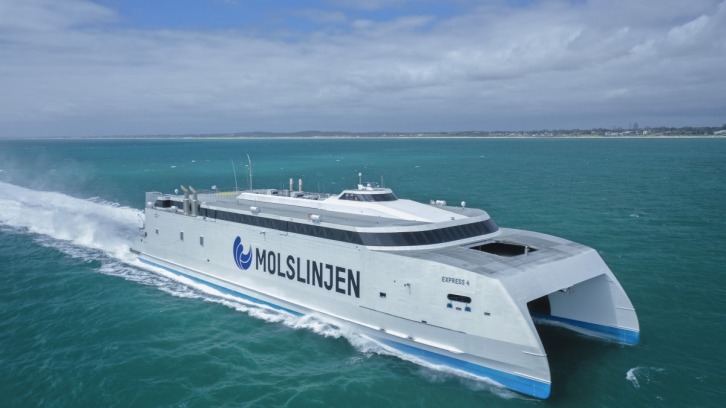 The new Auto Express 115, ‘Express 5’ is based on the successful Auto Express 109 design, constructed for Molslinjen. ‘Express 4’ (shown) was delivered by Austal in January 2019 and is operating in the Kattegat Sea, Denmark. (Image: Austal)