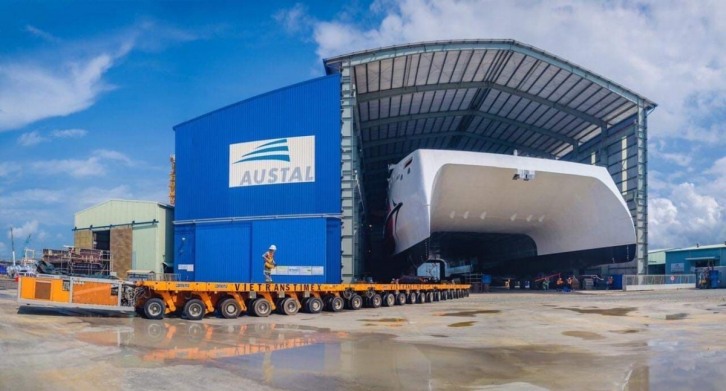 Austal Vietnam launches first vessel - 94 metre catamaran ferry for Trinidad and Tobago May 25, 2020 Austal Limited (ASX:ASB) is pleased to announce that Austal Vietnam has successfully launched Hull 397, a 94 metre high-speed catamaran for the National Infrastructure Development Company (NIDCo) of Trinidad and Tobago, from the company’s shipyard in Vung Tàu. The vehicle-passenger ferry, to be known as APT James, is the first vessel to be constructed by Austal Vietnam, in just 20 months, following the official opening of the shipyard in November 2018. The vessel is now in the final stages of fit out, prior to delivery to NIDCo in the 2nd half of CY2020. Austal Chief Executive Officer David Singleton said the successful launch of the ‘Auto Express 94’ catamaran was a fantastic accomplishment for Austal Vietnam, especially during the COVID-19 pandemic, and welcome news for the people of Trinidad and Tobago. “We couldn’t be more pleased with the performance of the 450-strong Austal Vietnam team, launching this impressive new vessel, their very first, at this challenging time in world history,” Mr Singleton said. “To their great credit and like all of our shipbuilding teams around the world, the Austal Vietnam team have continued working diligently and effectively during the COVID-19 pandemic to complete and launch APT James, while meeting all applicable Government Health and Safety guidelines. “This highly anticipated and exciting new ship for NIDCo is going to have a very positive and immediate effect on Trinidad and Tobago’s ‘sea bridge’ by improving the overall performance, reliability and amenity of this essential inter-island ferry service,” he added. The Austal Auto Express 94 is an all-new aluminium catamaran design, with capacity for 926 passengers and 250 cars, travelling at speeds up to 37.5 knots. The ship will feature the very latest in Austal’s ‘smart ship’ technology, including an advanced Motion Control System, to deliver a more comfortable and stable ride for passengers and crew. The launch, which took place over 5 days, comprised the rolling out of the vessel on a self-propelled modular transporter (SPMT) from Austal Vietnam’s Vung Tàu shipyard onto a barge, which was then towed up the Saigon River to Ho Chi Minh City, where the vessel was lowered into the water via floating dock. The vessel was then towed back to Vung Tàu, where the vessel will be kept alongside for final internal fit out under scheduled delivery, in the second half of 2020. Austal Vietnam has already commenced construction on the shipyard’s next project, a new 41 metre high speed catamaran ferry for SGTM of Mauritius, announced in January 2020.