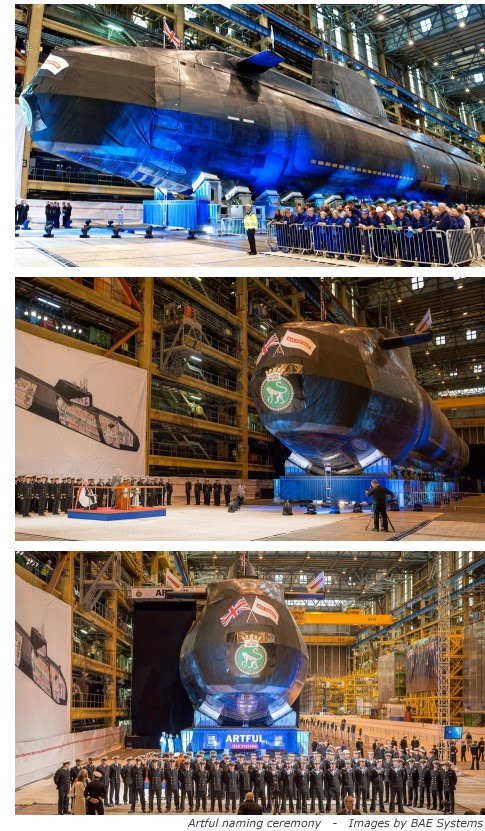 “With this ceremony Artful moves one step closer to joining her sister vessels HMS Astute and HMS Ambush in the Royal Navy fleet, equipping the submarine service with a class of highly capable vessels.”