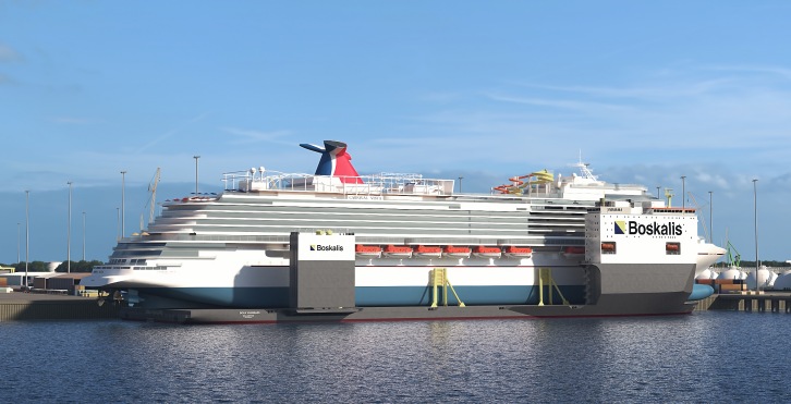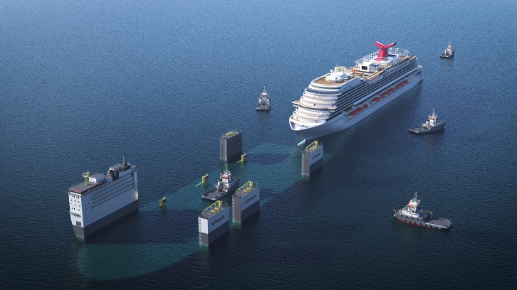 Papendrecht - 2 July 2019 Royal Boskalis Westminster N.V. (Boskalis) has been awarded a contract by Carnival Cruise Line to lift cruise ship Carnival Vista out of the water onto the BOKA Vanguard and transport it to a shipyard facility for a dry docking operation. This is a world first operation that will take place in the coming weeks in Freeport, Bahamas. Carnival Vista is the second largest cruise ship in the Carnival fleet with a capacity of nearly 4,000 passengers and a length in excess of 300 meters. Due to technical issues with Carnival Vista’s azipods, the ship’s main propulsion system, the vessel must be repaired in a dry dock which is currently not available in the region. Boskalis offers a unique solution to facilitate this dry dock repair by deploying the world’s largest semi-submersible heavy lift vessel BOKA Vanguard. Carnival Vista will be loaded onto the BOKA Vanguard off the coast of Freeport, Bahamas. This loading and lifting operation is planned to take place between 12 and 14 July. The BOKA Vanguard will then safely transport Carnival Vista to a nearby shipyard facility where the repairs will take place whilst the cruise ship is resting on the BOKA Vanguard. Upon completion of the repairs, Carnival Vista will be offloaded in time for its next cruise voyage later this month. Animation by Royal Boskalis Westminster NV