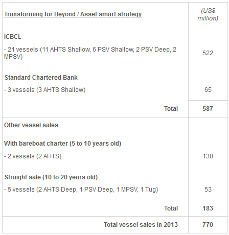 At the end of November 2013, BOURBON signed an agreement with Standard Chartered Bank (“SCB”) for the sale and bareboat charter of 6 new build vessels for a total amount of approximately US$ 150 million. The ownership of 3 vessels has been transferred for an amount of nearly US$ 65 million at year end. The remaining 3 vessels will be delivered to SCB during the second half of 2014. This agreement provides for a fixed bareboat charter rate of 10.2% per year for 10 years. In addition to vessel disposals in line with the “Transforming for Beyond” action plan, BOURBON sold older vessels in 2013 for a total value of US$ 183 million, some of which included a bareboat charter agreement. Through the implementation of its active fleet management program, BOURBON has achieved US$ 770 million of vessel sales in 2013, generating a capital gain of approximately US$ 180 million. As expected, BOURBON free cash flow will be positive for the second half and full year 2013, and the level of its debt will be reduced. Active fleet management Summary of vessel sales in 2013