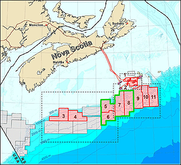 The Canada-Nova Scotia Offshore Petroleum Board (CNSOPB) announced that BP was the successful bidder for blocks five, six, seven and eight in the Call for Bids NS12-1. The blocks together cover an area of almost 14,000 square kilometres and are located approximately 300 kilometres off the Nova Scotia coast, southeast of Halifax, in water depths ranging from 100 to over 3000 metres.