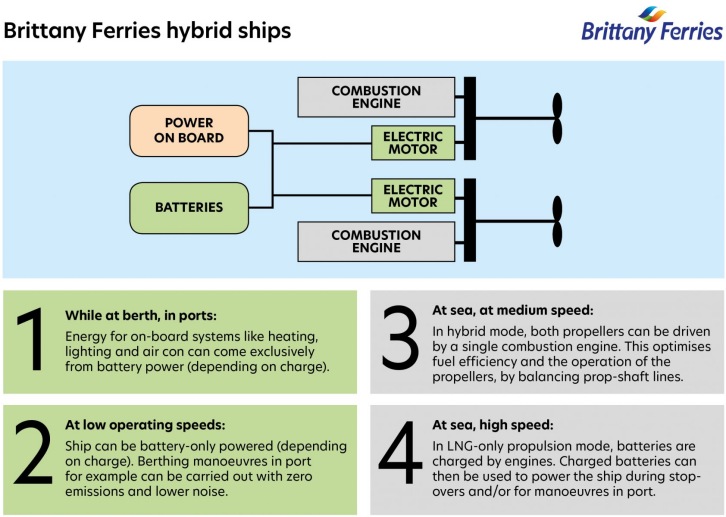 Image by Brittany Ferries “Fleet renewal is not a choice for Brittany Ferries; it is an imperative to secure our future,” said Christophe Mathieu, CEO Brittany Ferries. “Our customers rightly demand cleaner, greener vessels and our port partners expect us to be good neighbours. Furthermore, we will certainly face tighter regulation in the years ahead. The future of our company depends upon our ability to rise to the challenge today, to prepare for tomorrow. That is why I am so proud to announce these new vessels.” “They bring with them a host of innovations just as Bretagne and Normandie did when they were launched. Both vessels have served us well and we are grateful for the support of the regions that bear their name. They are much loved by customers and crew, but now is the time for us to look to the future and to plan for a brighter future, even as we battle the crisis we face today.” For passengers and for freight: Each ship has been carefully designed to suit the route on which it will operate, taking account of future trends in both passenger and freight traffic. To begin with, the garage will be longer and higher which means greater freight capacity. However, they will also be better adapted to new types of passenger vehicle. This includes the trend towards bigger cars. Today’s Mini for example is 25% longer and wider now than the version on sale when Bretagne was launched. Additional lane space will allow easier access upon boarding and disembarkation, particularly for passengers with mobility problems. The physical size of the garage means they will also be better suited for motorhomes. Meanwhile in-voyage charging will be available for electric car drivers, allowing them to fuel-up en route, ready for their arrival in France. There will be more cabins too. While Bretagne and Normandie have high (potential) passenger capacities, the reality is that night-time crossings can be limited by cabin availability. Both new ships will therefore come with more cabins, as well as an improved mix of cabin types. For example, there will be a big increase in top-end commodore cabins. Normandie’s replacement will benefit from 30 more commodores, as well as a C-Club airport-style lounge. Bretagne’s replacement will host 79 more commodores with a C-Club lounge as well as 18 more cabins for families of up to six people. Both ships will host an increase in pet-friendly cabins, ensuring four-legged travellers are well accommodated too. More details about services on board will be released in the months and years ahead. How the hybrid system works: The hybrid ships have two propellors. Each propeller is connected via a prop shaft to a separate gearbox. The gearbox manages power supplied from one LNG engine and to one reversible electric motor. The electric motor is used to either: • drive the propeller • charge batteries and/or power onboard systems in port When driving a propellor, the electric motor is fed by batteries. But it can also be boosted by power from the second LNG engine, configured via the gearbox for the second propellor. When operating in reverse, the electric motor charges batteries. Depending on charge, the batteries can also be used to power systems on board such as air conditioning, heating and lighting, for example when in ports.