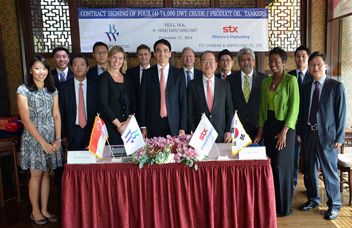 Singapore, 11 December 2014 BW Pacific has signed shipbuilding contracts with STX Offshore and Shipbuilding Co. Ltd. (STX) for four Long Range 1 (LR1) product tankers on 11 December 2014. The agreement with STX includes options for additional vessels. The four firm newbuildings will be delivered in late 2016 and early 2017 and is part of a fleet renewal program. Andreas Sohmen-Pao, Chairman BW Pacific, says: “BW Pacific looks forward to receiving high quality and technologically advanced newbuildings from STX Offshore and Shipbuilding. By renewing our current fleet with well-built vessels, BW Pacific will continue to strive for outstanding service to customers. We have strong ambitions in the product tanker segment and these vessels will continue our steady growth in the sector.” The newbuildings will bring BW Pacific's product tanker fleet size to 43.