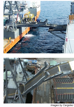 Designed to transfer military vehicles between ships at sea to support US Army and Marine Corps land forces as part of the US Navy’s ‘Sea Base’ strategy, Cargotec’s innovative ‘test article vehicle transfer system’ (TAVTS) has now successfully completed sea trials. These were carried out by the US Navy’s Strategic and Theatre Sealift Program Office (PMS 385) which is part of Program Executive Office Ships (PEO Ships). “This landmark capability will be a significant enhancement for future sea-basing logistics operations,” says Captain George M Sutton, program manager for PMS 385.