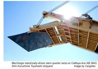 "On average, electric drives consume less energy than their hydraulic equivalents, therefore, their introduction into MOL's recent newbuilds was a natural progression in the company's environmental initiatives," says Mr Sjöberg. "When you replace hydraulically-powered deck machinery with electric versions, one of the greatest environmental benefits that you gain is the elimination of potential hydraulic oil leaks. These cause pollution and can also damage cargo. It was the high incidence of cargo damage that was a primary concern for car manufacturers, who ultimately put pressure on shipowners to come up with a solution to the problem." Last year Cargotec and the Shin-Kurushima Dockyard group also signed further agreements for four pure car carriers (PCCs) to be fitted with fully electrically-driven RoRo access equipment. "This means that five car carriers and two RoRos now have all of their RoRo equipment electrically-driven." Most of the world's pure car carrying (PCC), pure car/truck carrying (PCTC) and deepsea RoRo fleets feature MacGregor RoRo access equipment. Electrically-driven MacGregor RoRo cargo access equipment is a result of intensive R&D work, which was initiated in response to customers' requests. Cargotec's ability to develop equipment that not only meets numerous performance requirements, but also protects the environment, demonstrates its commitment to operating in a responsible manner and taking environmental considerations into account. The first ships with electrically-driven MacGregor RoRo equipment were delivered in 2006 - although this equipment was limited to internal systems. In 2009, four 2,000-unit PCTCs for PD Gram & Co AS, delivered from Kyokuyo Shipyard in Japan. Viking Odessa, Höegh Caribia, City of Oslo and Viking Constanza, all feature a comprehensive outfit of internal MacGregor cargo access equipment including: ten hoistable car deck panels, one access ramp, four movable ramps and two ramp covers on each ship. Cargotec improves the efficiency of cargo flows on land and at sea - wherever cargo is on the move. Cargotec's daughter brands, Hiab, Kalmar and MacGregor are recognised leaders in cargo and load handling solutions around the world. Cargotec's global network is positioned close to customers and offers extensive services that ensure the continuous, reliable and sustainable performance of equipment. Cargotec's sales totalled EUR 2.6 billion in 2010 and it employs approximately 11,000 people. Cargotec's class B shares are quoted on NASDAQ OMX Helsinki under symbol CGCBV. www.cargotec.com MacGregor is the global market-leading brand in marine cargo handling and offshore load-handling solutions. Customer-driven MacGregor engineering and service solutions for the maritime transportation industry and the offshore load-handling and naval logistics markets are used on board merchant ships, offshore support vessels, and in ports and terminals. www.macgregor-group.com Cargotec press release |