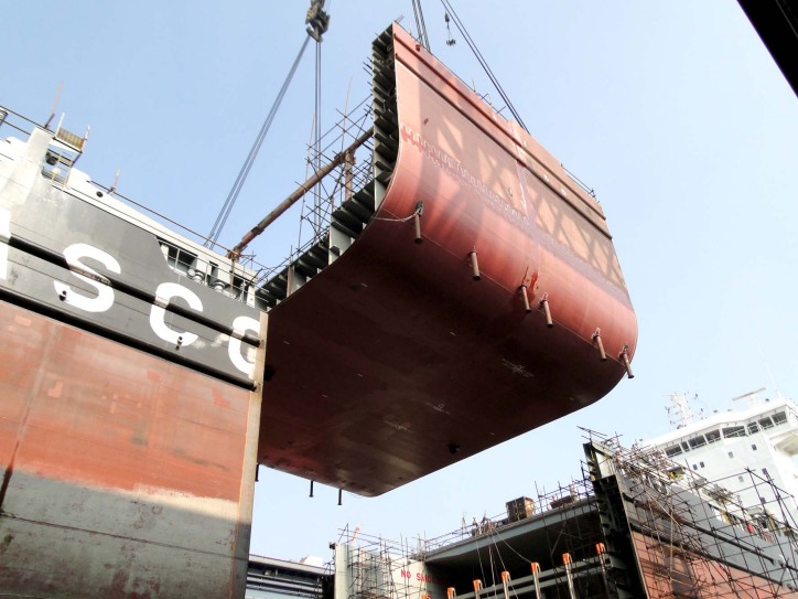 MV Corsar had the mega block lifted and commenced erection in the middle of the mother ship which had been cut into two sections for jumboising conversion.