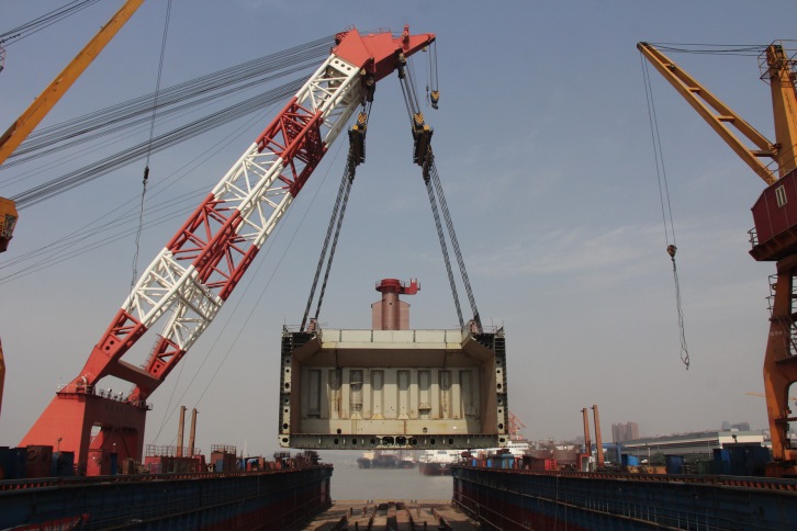At 3:58 pm, May 28, the No.7 39,100 DWT bulk carrier had the initial mega block of 1,200 tons lifted into the Changshan Floating Dock, indicating the commencement of block erection in floating dock.