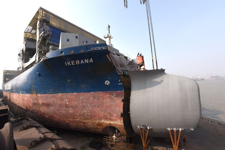 19 November 2014 At 1:28 p.m.on November 17, the newly-fabricated bulbous bow was lifted into Hengshan Floating Dock for erection with the existing part of MV Ikebana. According to the schedule, the optimization project for MV Ikebana, including bulbous bow renewal, will be completed within twelve days of docking period to improve propulsion efficiency and to reduce oil consumption.
