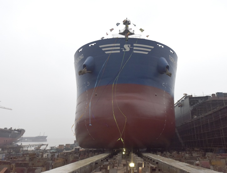 3 February 2015 The day of January 26th saw two milestones completed in Shipbuilding Line No.3 at Qidong: At 4:28 pm, the launching ceremony of No. 17 64K bulk carrier built for Great Horse was held, which was attended by owners, classifications, Mr. Ji Jun, Vice-President and heads of Chengxi and guests concerned. Following that, the keel laying ceremony of No. 18 64K bulk carrier was held, which indicated the commencement of its slipway erection. Chengxi Shipyard Co., Ltd. press release