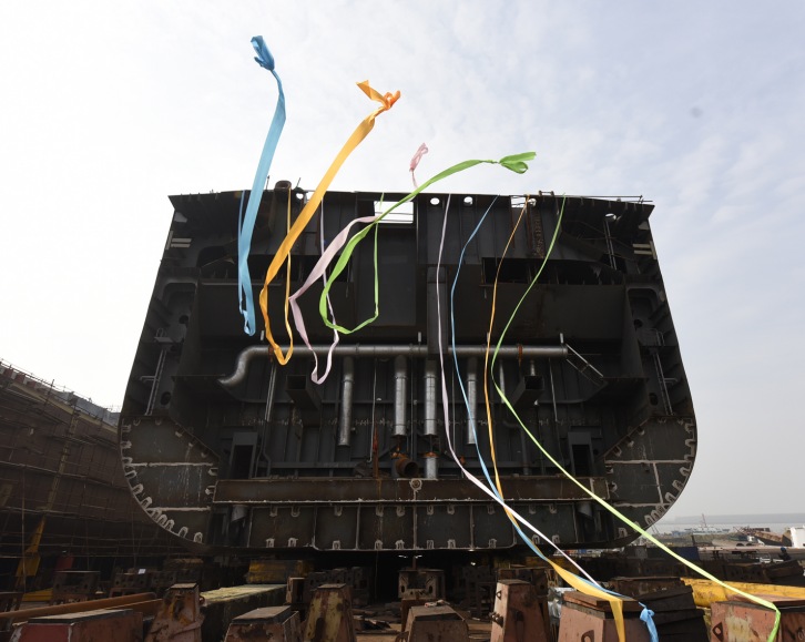 13 April 2015 The day of April 12 saw both launching and keel laying completed in Shipbuilding Line No.2 at Rugao: The 168-meter forebody of the 25K self-unloader was launched at 8:18 a.m. The vessel is built for Lower Lakes Towing Ltd. Present at the ceremony were representatives of owners, classifications, Mr. Ji Jun, Vice-President of Chengxi Shipyard and others heads and guests. Following that, the keel laying of No.33 64K bulk carrier was completed, which indicated the commencement of slipway erection.