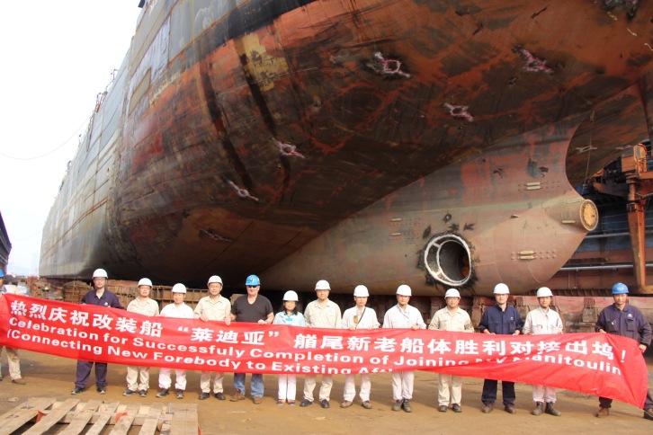 22 May 2015 A celebration was held for the completion of joining project for the 25,000 DWT self-unloading vessel in Chengxi Shipyard at 16:00 p.m. on May 14. The newly-built forebody was successfully connected to the existing afterbody, well-prepared for the subsequent work in afterbody and accommodation. Chengxi Shipyard Co., Ltd. press release