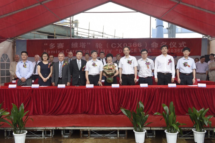 The ceremony started with the speech by Mr. Lu Ziyou, who mentioned that the No.2 38,800 DWT bulk carrier was a great achievement by the integration strategy of CSSC’s financing, design and new building, featuring environmental protection and energy-efficiency etc, and it also fulfilled all the forward-looking requirements of new rules and regulations with the most cutting-edge design. He also expressed his hearty thanks to all the owners, supervision team, and classifications. Following that, Mr. Yang Li, and Mr. Boris Jivotenko made speeches by extending their appreciation for Chengxi’s good job and dedication in constructing this great vessel. And they also expected a further cooperation between the three parties in future. Lastly, the Vessel was named by Ms. Yin Hao into “M.V. Dolce Vita”. She wished the vessel a safe journey in future. Chengxi Shipyard Co., Ltd. press release