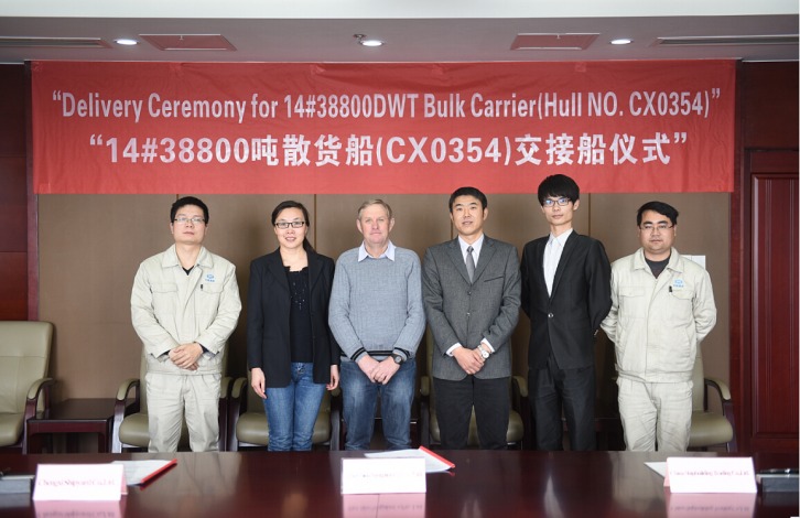 20 February 2016 The delivery ceremony for No.14 39,500 dwt bulk carrier was held in Chengxi Shipyard at 13: 58 p.m. on February 16. The great vessel built for CNCO. was launched last Oct.12 and named this Jan.8. As the first delivery accomplished by Chengxi this year, it will contribute to optimizing the production capabilities and lay a solid foundation for the following projects this year. Chengxi Shipyard Co., Ltd. press release